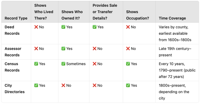 Whether you're a researcher, homeowner, or just a curious local, this guide will help you understand the key record types used to trace a home's ownership and residency over time—plus how they work together.