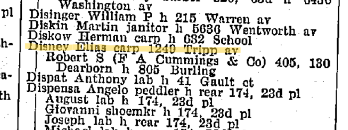 For the time period when the Disneys lived in Chicago, we do not have a large paper trail. We have the 1900 census mentioned previously, as well as a directory that lists Elias Disney at 2140 Tripp Avenue, before the house was renumbered to 2156 North Tripp Ave.