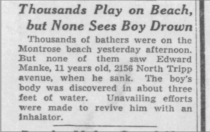 The two couples would also have to have moved out by 1938, when our next piece from the timeline comes into play. In late July of 1938, Edward Manke Jr., who lived at 2156 North Tripp Avenue, drowned at the shores of Montrose Beach. He was only eleven years old.