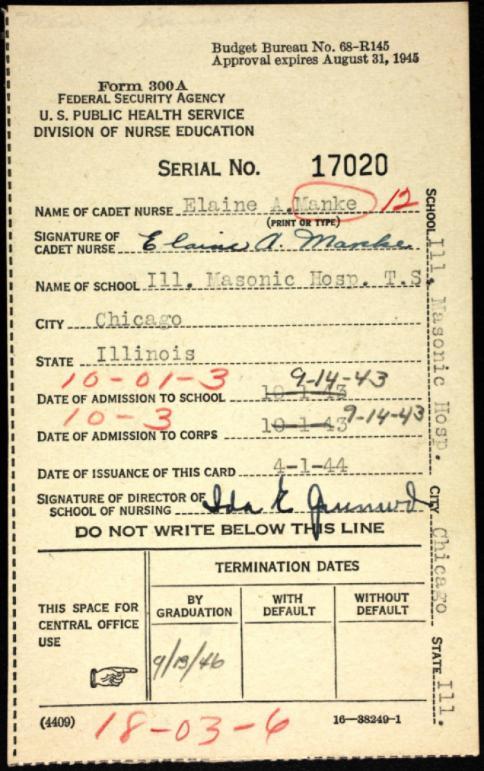 The other document we have is Elaine's file card from the US World War II Cadet Nursing Corps, dated 1944. It lists her name, her school, as well as the date of her admission to the Corps.