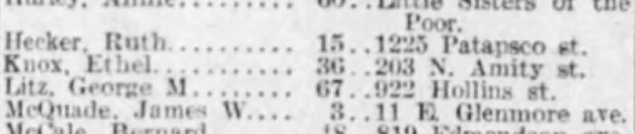 This census listed James Knox, his wife Mary, and their daughter, Ethel, as the occupants. What should be noted here is that James Knox Jr. is not listed. He had run away from home before the family moved to Baltimore and had enlisted in the military. He will not be seen by his family until the late 1920s. For now, the rest of the Knoxes lived at the home; James Knox worked as a watchman at a bank, and his daughter Ethel worked as a laundress at a hospital.