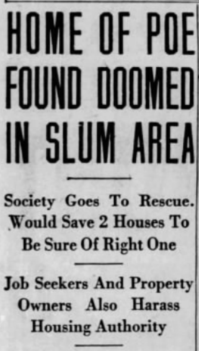 In the early 1940s, the house was owned by the city, but by 1947, the house was converted into a shrine to the author by The Poe Society, a group of Poe enthusiasts. The Poe Society advocated for the house when it was slated for demolition and succeeded in saving it. Renting it for $5 annually (or $72.92 as of Sept. 2025), The Poe Society sought to create a place where Poe's history would be preserved, and in 1949, after some renovations, the house was officially opened to the public.