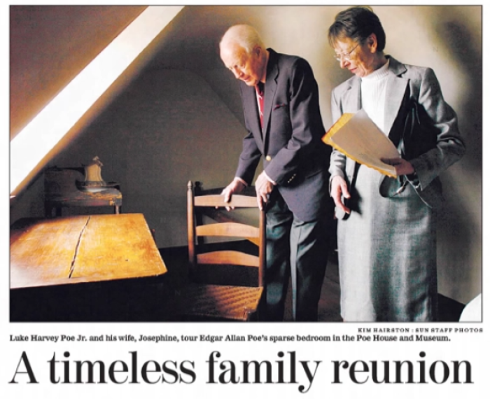 Next on our timeline is a family reunion in 2005. Poe did not have any children, but he did have relatives. Luke Harvey Poe Jr., a distant relative of Poe, was given a personal tour of the home and discussed Poe with the curator, Jeff Jerome.