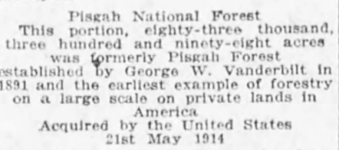 Six years after his death, in 1920, a tablet dedicated to George Vanderbilt was placed in Pisgah National Forest. An article from that time wrote what the inscription was on the tablet: