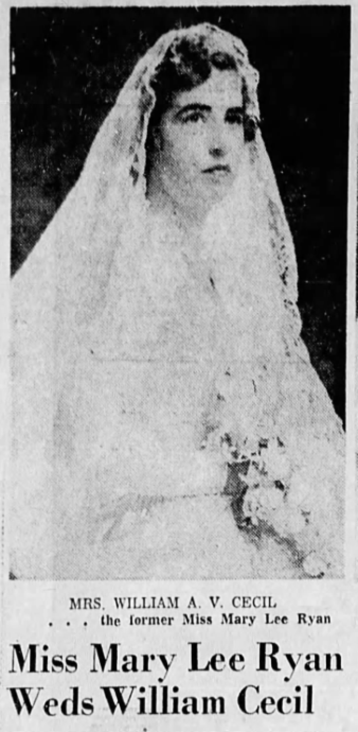 Continuing on with our timeline, in 1957, William, Cornelia's youngest son, would marry Mary Lee Ryan. The bride wore a gown of white satin adorned with heirloom lace. William's brother, George, served as his best man.