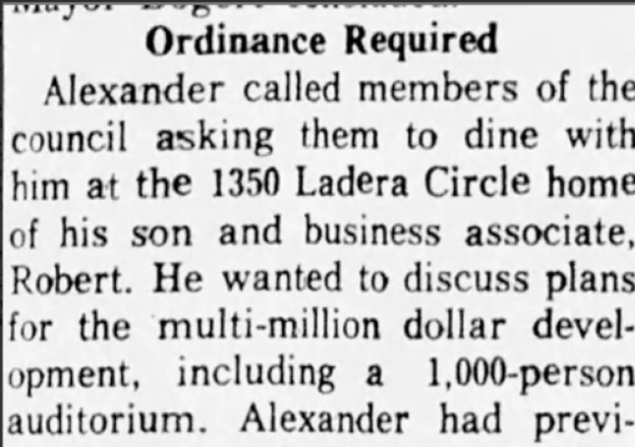 The house existed in relative obscurity before late 1962. One of the only references to 1350 Ladera Circle before 1962 is an article from The Desert Sun about the building of a high-rise hotel. In it, the house is mentioned as the meeting place for George Alexander and city council members to discuss plans for the hotel development.