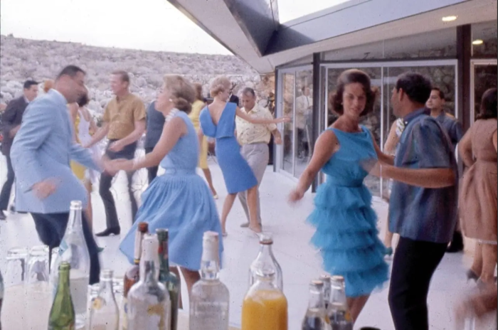 We have some photos that were included in the original Look Magazine article; the first of them features Robert and Helene Alexander reclining on their circular sofa. The second is a more lively photo, depicting a party at the Alexander's home, where people are dancing out on the patio.