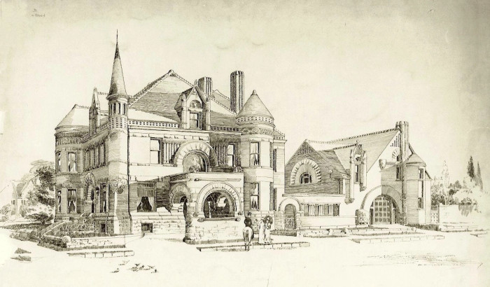 A sprawling estate, the house at 303 South Tenth St. was made of brick and stone and included three towers. It was also designed in the Romanesque Revival style and contained detailed woodwork as well. The photos below show what it would have been like when Frederick Pillsbury lived there.