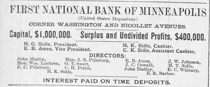 Frederick and Alice had four children: Harriet (born 1879), Carlton (born 1882), Helen (born 1886), and the youngest, Alice (born 1889). We do have some documents from before 1892, including a notice from the newspaper stating that Frederick was one of the directors of the First National Bank of Minneapolis. As for his wife, not much was found from these four years, except for a notice placed in the Star Tribune that stated on which day Mrs. F.C. Pillsbury preferred her callers to visit her.