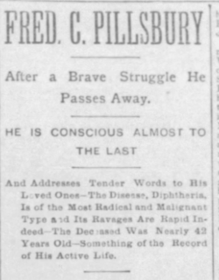 The family lived in relatively peaceful opulence until 1892, when Frederick caught a case of diphtheria. A swift and severe illness, Frederick did not survive for long and died at the age of 38 in May 1892 (the article incorrectly puts him at around 42 years old). His death was a great loss to the community and to his family. The adjacent article, partially shown here, goes into more depth about his death and his contributions to the community (please see the timeline link below for the full article).