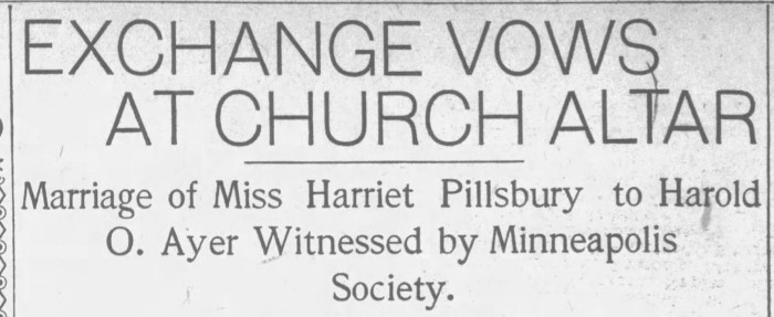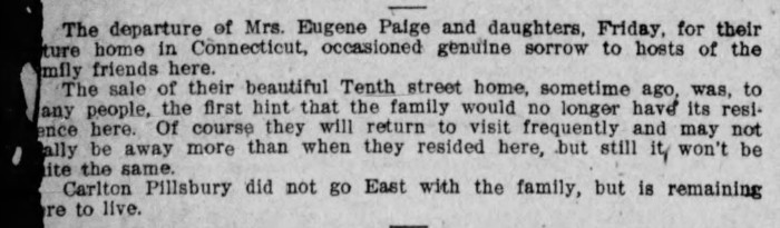 As soon as Harriet tied the knot, the wedding bells were ringing again, but this time they were for Alice Pillsbury. In 1903, she married New York State businessman Eugene W. Paige, in a move that shocked everyone but her friends, as it seems that she kept their relationship under wraps for the most part before the wedding. The article also stated that she would be moving to New York after her wedding but would most likely keep the house at 303 South Tenth St. as a winter home for the family.