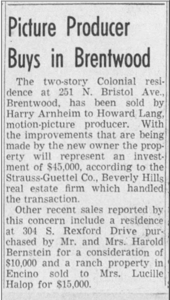 Not much else is known about Lang, but presumably he tried to sell the house in 1949, when another “For Sale” ad appeared. Printed in The Los Angeles Times, the detailed ad described a landscaped yard, a playroom with large windows, a paneled library, and a breakfast room.