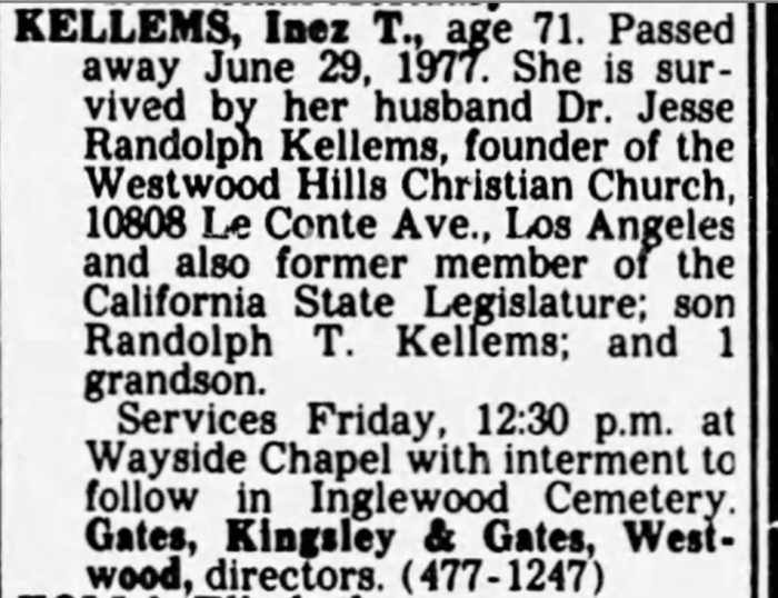 Little is known about the Kellems family during the following years until 1977, when The Los Angeles Times published a notice about the death of Inez Kellems. She was survived by her husband Jesse, their son Randolph, and a grandson. Inez passed away on June 29, 1977, at the age of 71.