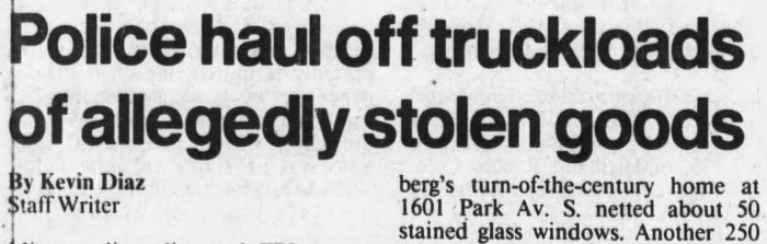 But in 1990, the Legg House’s story took a dramatic turn. The FBI uncovered a $20 million cache of rare stolen books at the Iowa home of notorious collector Steven Blumberg. As investigators dug deeper into Blumberg’s activities, they traced another stash—this time of stained glass and antiques—to 1601 Park Avenue in Minneapolis.