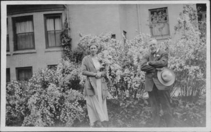 The fifth and final photograph was taken at a different angle of the house, possibly at the back or sides. A man and a woman pose for the camera in front of the flowering bushes.