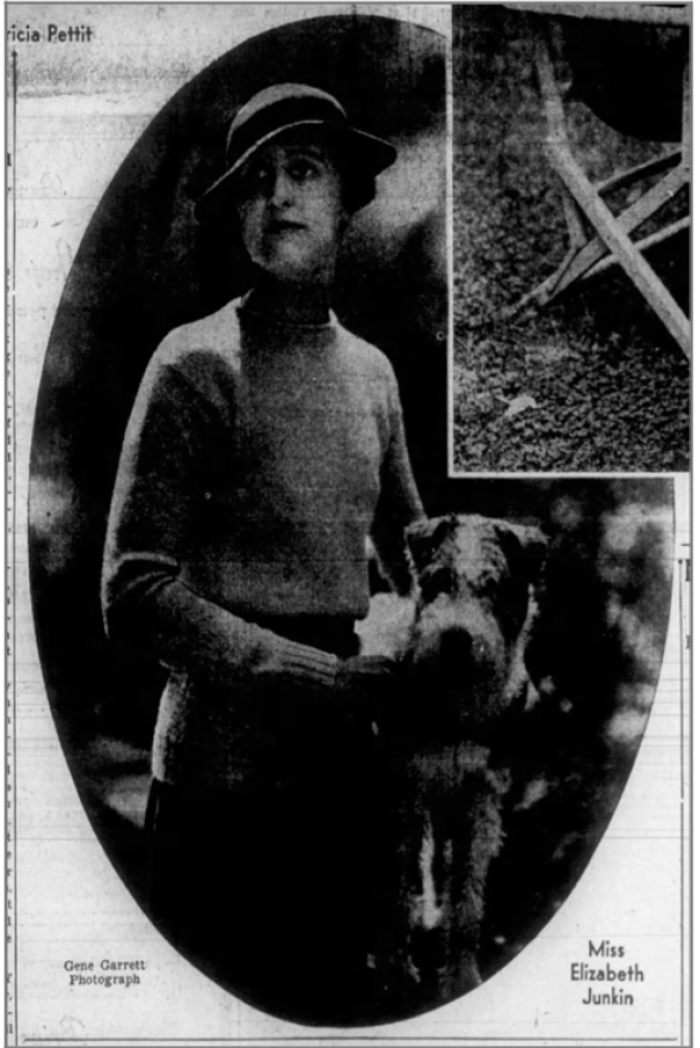 We now go forward in years to 1935, where on September 29th, Elizabeth Junkin graced the newspaper with a photograph of herself and her dog, Happy. The caption stated that she and her dog often take walks around the lake.
