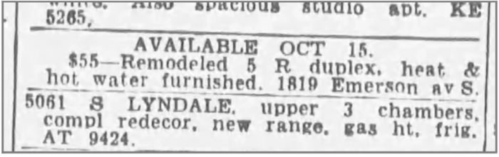 Regrettably, the tea parties and walks around the lake would have ceased by September 30, 1939, as an ad for vacancies in a duplex at 1819 Emerson Ave S appeared in the newspaper. This leads us to the possibility that the home was turned into a duplex after the Junkins moved out.