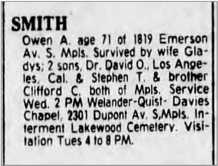 Soon after, in 1976, Owen Smith, who still lived at the house with his wife Gladys, died at age 71. He left behind Gladys, their two children, and a brother named Clifford.