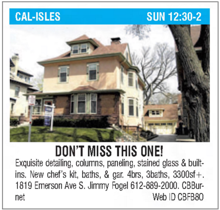We must skip a few years to arrive at our next stop, when the house was up for sale once again. This time, on October 19th, 2008, the house was advertised in the Star Tribune, but no price was listed.