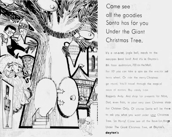 By 1968, Dayton’s replaced the Dickens village with a new theme: Under the Giant Christmas Tree. In an interview with the Minneapolis Star, Shimota explained, “this year we decided to give it back to the children.” The auditorium transformed into the magical world a child imagines while lying under the tree, gazing up at glittering lights and oversized ornaments. A massive tree made of 60,000 hand-cut needles towered above visitors, with 36-inch round ornaments suspended overhead and animated scenes designed to resemble enormous Christmas presents.